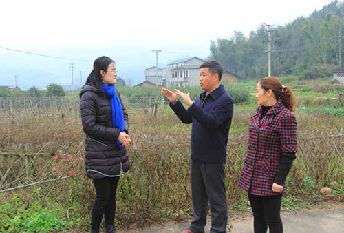 林善平代表(中)走訪回鄉(xiāng)的大學(xué)畢業(yè)生施穎( 左一),鼓勵(lì)她扎根山區(qū),為山區(qū)發(fā)展貢獻(xiàn)聰明才智。攝影/ 王爭