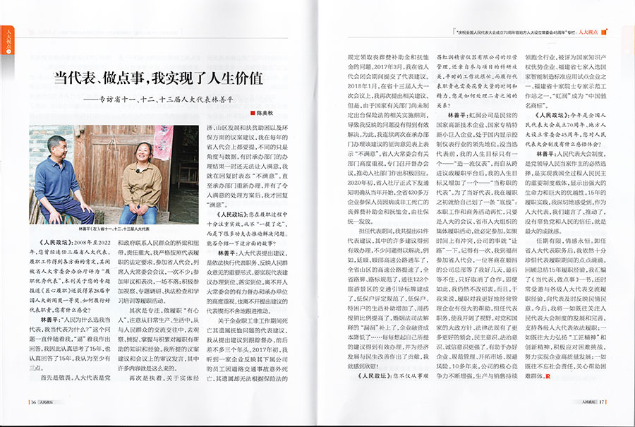 林善平:虹潤公司是民營的國家高新技術(shù)企業(yè)、國家專精特新小巨人企業(yè),處于國內(nèi)顯示控制儀表行業(yè)的領(lǐng)先地位。沒當(dāng)選代表前,我的人生目標(biāo)只有一個——“造一流儀表”,而自從跨進議政履職平臺后,我的人生目標(biāo)又增加了一個——“當(dāng)稱職的代表”。為了當(dāng)好代表,我在履職之初就給自己劃了一條“底線”:本職工作和商務(wù)活動再忙,只要是人大的會議、省市人大組織的集體履職活動,就必定參加。如果時間上有沖突,公司的事就“讓路”一下。記得有一次,我到福州參加省人代會,一位客商在順昌的公司總部等了我好幾天,最后等不住,只好取消了合作。即便如此,我仍然不改初衷。而且,于我來說,履職對我更好地經(jīng)營管理企業(yè)有很大的幫助。擔(dān)任代表職務(wù),使我開闊了視野,對黨和國家的大政方針政策、法律法規(guī)有了更多更好的領(lǐng)會,民主意識、法治意識、誠信意識更強了,有助于辦好企業(yè)、規(guī)范管理、開拓市場、規(guī)避風(fēng)險。10多年來,公司的核心競爭力不斷增強,生產(chǎn)與銷售持續(xù)領(lǐng)跑全行業(yè),被評為國家知識產(chǎn)權(quán)優(yōu)勢企業(yè)、福建省七家入選國家智能制造標(biāo)準(zhǔn)應(yīng)用試點企業(yè)之一、福建省十家院士專家示范工作站之一,“虹潤”成為“中國馳名商標(biāo)”。