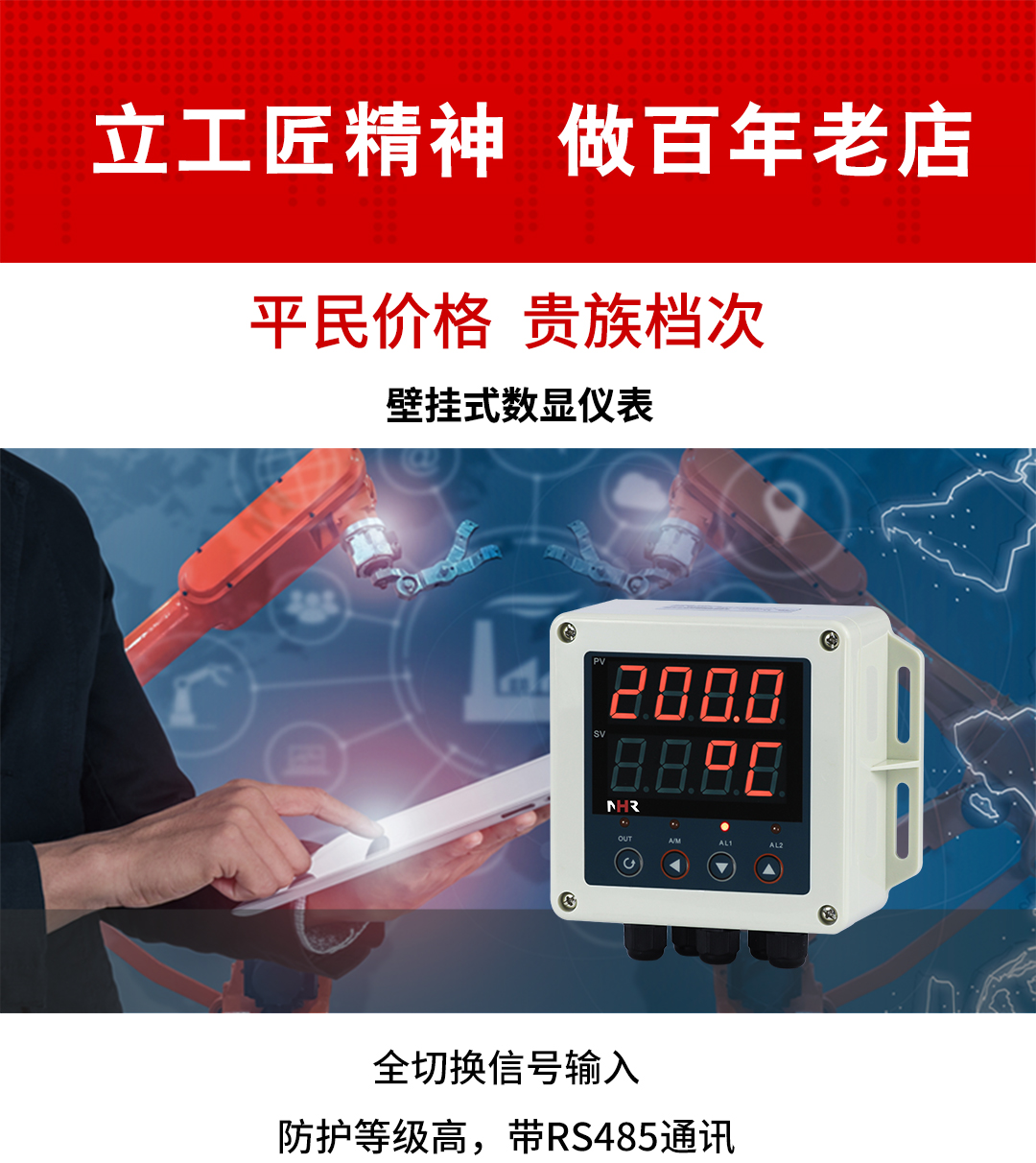 虹潤公司是專業(yè)生產(chǎn)數(shù)顯表的國家專精特新“小巨人”企業(yè),生產(chǎn)的壁掛式數(shù)顯儀表,具有全切換信號輸入,高抗干擾,IP65防護(hù)等級,全隔離設(shè)計(jì),變送輸出或RS485通訊等特點(diǎn)。產(chǎn)品獲得巡回檢測顯示方法及裝置、一種儀表電源等2項(xiàng)國家發(fā)明專利,主持起草工業(yè)過程控制系統(tǒng)用模擬輸入兩位或多位輸出儀表、物聯(lián)網(wǎng)智能溫度儀表通用技術(shù)條件等2項(xiàng)國家標(biāo)準(zhǔn),,以及通信系統(tǒng)多通道數(shù)據(jù)采集控制終端規(guī)范軍用標(biāo)準(zhǔn),參與國際5G標(biāo)準(zhǔn)制定,取得簡易數(shù)顯儀表等3項(xiàng)相關(guān)軟件著作權(quán)。產(chǎn)品廣泛應(yīng)用于電力、石化、冶金、化工、造紙、食品、輕工、制藥、熱處理、水處理、機(jī)械配套等各種工業(yè)現(xiàn)場。
