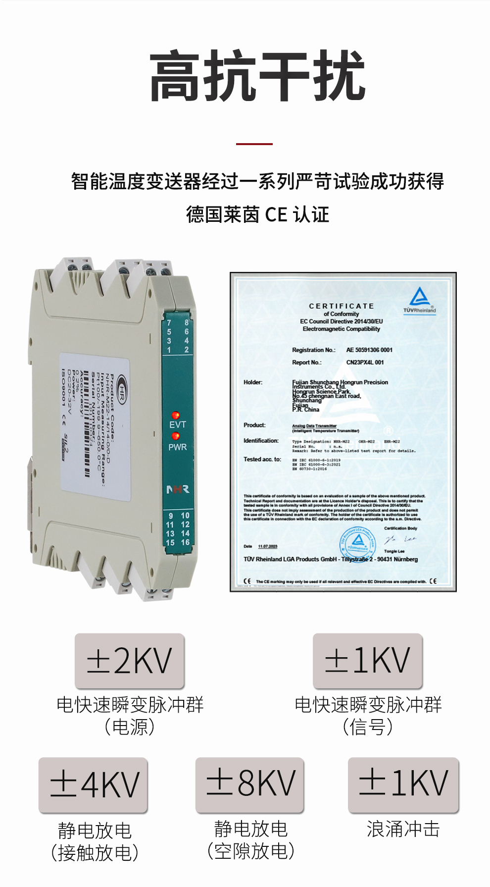 虹潤公司是專業(yè)生產(chǎn)溫度變送器的國家專精特新“小巨人”企業(yè)。生產(chǎn)的溫度變送器,具有采用磁隔離技術(shù),配套編程器可修改參數(shù),抗干擾能力強(qiáng),穩(wěn)定性好,帶RS485或HART通訊等特點(diǎn)。該產(chǎn)品不僅通過HART基金會(huì)認(rèn)證、德國萊茵 CE 認(rèn)證與 SIL 功能安全認(rèn)證,還獲得具備減震抗干擾能力的溫度變送器、信號(hào)隔離器、一種二端子模塊、無源信號(hào)隔離器等4項(xiàng)國家發(fā)明專利,主持起草物聯(lián)網(wǎng)智能溫度儀表、現(xiàn)場設(shè)備工具(FDT)接口規(guī)范、工業(yè)過程測量和控制系統(tǒng)用溫度變送器等3項(xiàng)國家標(biāo)準(zhǔn),以及通信系統(tǒng)多通道數(shù)據(jù)采集控制終端規(guī)范軍用標(biāo)準(zhǔn),參與國際5G標(biāo)準(zhǔn)制定,取得溫度變送器等5項(xiàng)相關(guān)軟件著作權(quán)。產(chǎn)品廣泛應(yīng)用于石油、電力、化工,冶金、制藥、紡織、橡膠制造等工業(yè)領(lǐng)域現(xiàn)場自動(dòng)化測溫過程。