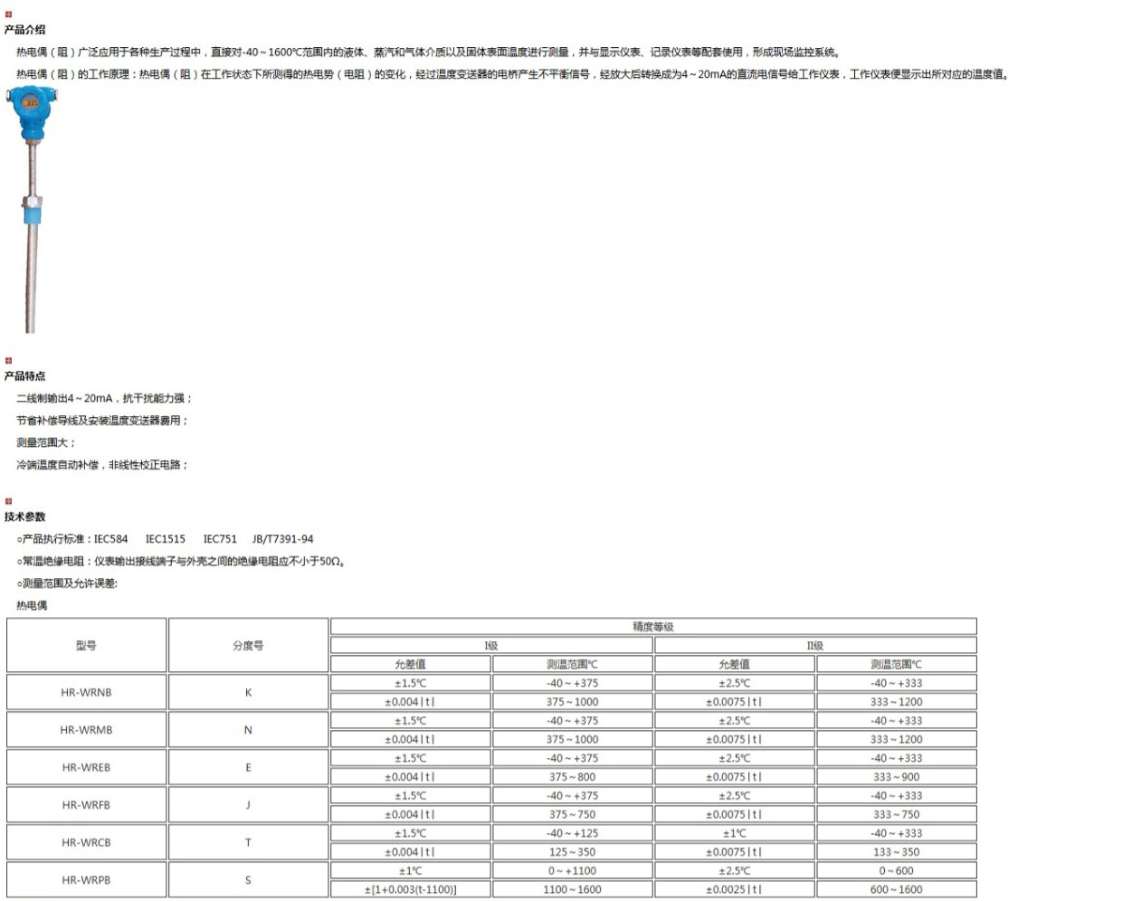 帶溫度變送器熱電偶(阻),由基準源、冷端補償、放大單元、線性化處理、V/I轉換、斷偶處理、反接保護、限流保護等電路單元組成。它是將熱電偶(阻)產(chǎn)生的熱電勢經(jīng)冷端補償放大后,再帽由線性電路消除熱電勢與溫度的非線性誤差,最后放大轉換為4~20mA電流輸出信號。