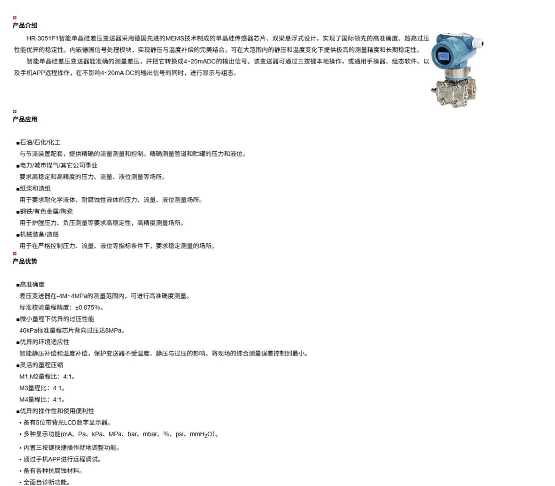 HR-3051F1智能單晶硅差壓變送器能準(zhǔn)確的測(cè)量差壓,并把它轉(zhuǎn)換成4~20mADC的輸出信號(hào)。該變送器可通過三按鍵本地操作,或通用手操器、組態(tài)軟件、以及手機(jī)APP遠(yuǎn)程操作,在不影響4~20mA DC的輸出信號(hào)的同時(shí),進(jìn)行顯示與組態(tài)。