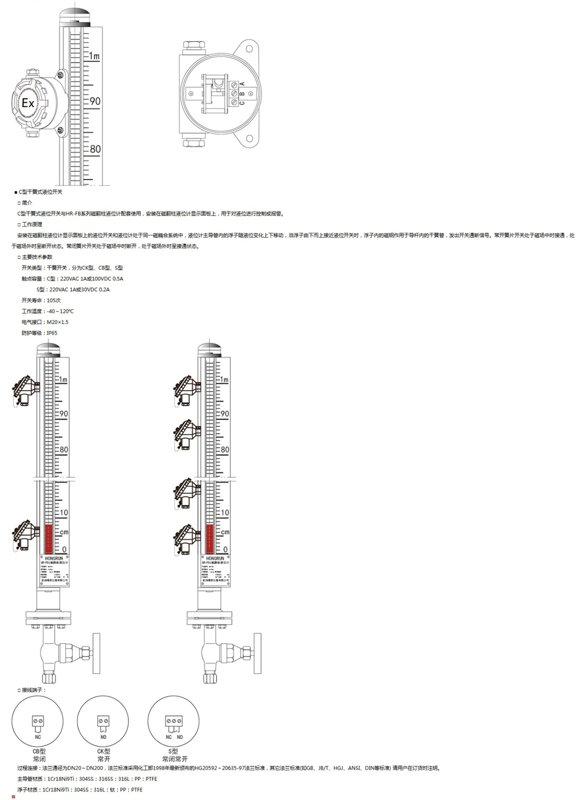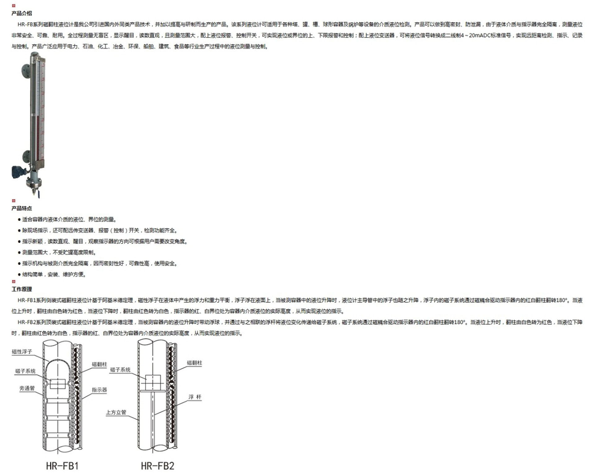 HR-FB系列磁翻柱液位計(jì)是我公司引進(jìn)國內(nèi)外同類產(chǎn)品技術(shù),并加以提高與研制而生產(chǎn)的產(chǎn)品。該系列液位計(jì)可適用于各種塔、罐、槽、球形容器及鍋爐等設(shè)備的介質(zhì)液位檢測。產(chǎn)品可以做到高密封、防泄漏,由于液體介質(zhì)與指示器完全隔離,測量液位非常安全、可靠、耐用。