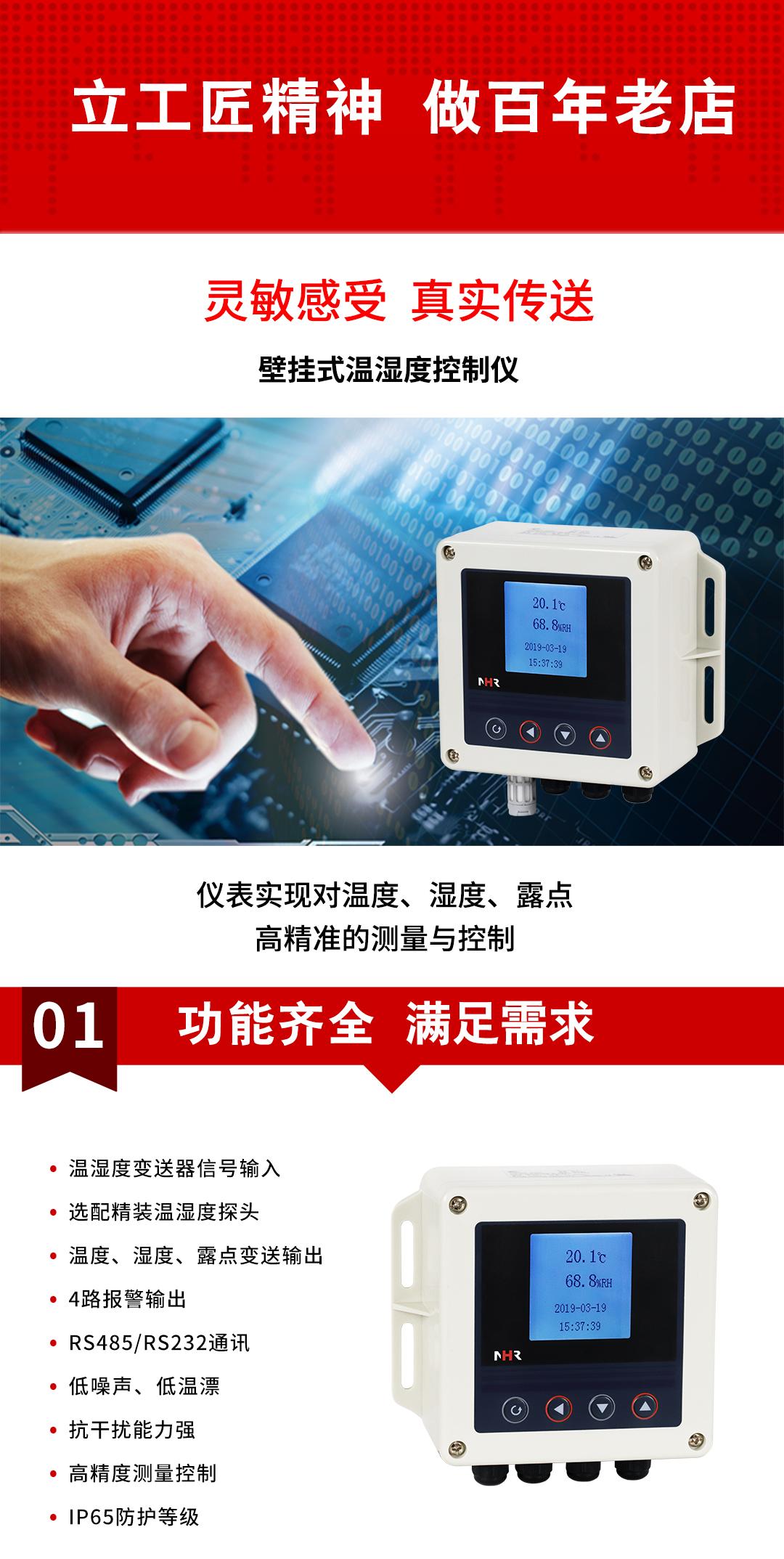 虹潤(rùn)公司是專(zhuān)業(yè)生產(chǎn)環(huán)境監(jiān)測(cè)儀表的國(guó)家專(zhuān)精特新“小巨人”企業(yè)。生產(chǎn)的壁掛式溫濕度控制器,具有溫度、濕度、露點(diǎn)高精準(zhǔn)的測(cè)量,多種輸出類(lèi)型,穩(wěn)定性強(qiáng),RS485/RS232通訊,IP65防護(hù)等級(jí)等特點(diǎn)。產(chǎn)品獲得一種手持式低功耗溫濕度檢測(cè)儀、大屏幕溫濕度記錄儀等2項(xiàng)國(guó)家發(fā)明專(zhuān)利,主持起草物聯(lián)網(wǎng)智能溫度儀表通用技術(shù)條件、冷鏈溫度記錄儀等2項(xiàng)國(guó)家標(biāo)準(zhǔn),通信系統(tǒng)多通道數(shù)據(jù)采集控制終端規(guī)范軍用標(biāo)準(zhǔn),以及現(xiàn)場(chǎng)設(shè)備集成等5項(xiàng)智能制造國(guó)家標(biāo)準(zhǔn),參與國(guó)際5G標(biāo)準(zhǔn)制定,取得溫濕度儀表等2項(xiàng)相關(guān)軟件著作權(quán)。產(chǎn)品廣泛應(yīng)用于工業(yè)現(xiàn)場(chǎng)、農(nóng)業(yè)大棚、倉(cāng)儲(chǔ)物流、地下管廊、養(yǎng)殖孵化、配電機(jī)房等諸多領(lǐng)域。