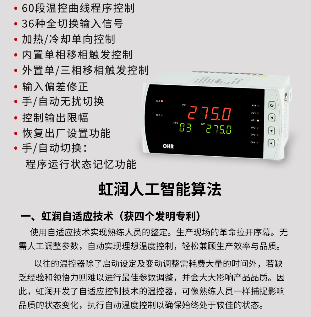 虹潤(rùn)公司是專業(yè)生產(chǎn)溫控器的國(guó)家專精特新“小巨人”企業(yè)。生產(chǎn)的程序段智能溫控器,具有真正人工智能算式,無需人工整定參數(shù),控制精度可達(dá)±0.1°C,60段溫控曲線程序,無超調(diào)、欠調(diào)等特點(diǎn)。產(chǎn)品獲得模糊PID控制儀及控制方法、人工智能調(diào)節(jié)器、智能化控制器、移相觸發(fā)控制器、閥門自動(dòng)手動(dòng)無擾動(dòng)操作控制方法及裝置等5項(xiàng)國(guó)家發(fā)明專利,主持起草智能溫度儀表通用技術(shù)條件、工業(yè)過程控制系統(tǒng)用模擬輸入兩位或多位輸出儀表、工業(yè)過程測(cè)量和控制系統(tǒng)用智能調(diào)節(jié)器等3項(xiàng)國(guó)家標(biāo)準(zhǔn),,以及通信系統(tǒng)多通道數(shù)據(jù)采集控制終端規(guī)范軍用標(biāo)準(zhǔn),參與國(guó)際5G標(biāo)準(zhǔn)制定,取得60段PID自整定調(diào)節(jié)器等3項(xiàng)相關(guān)軟件著作權(quán)。產(chǎn)品廣泛應(yīng)用于電力、石化,冶金、制藥、食品等幾乎所有工業(yè)現(xiàn)場(chǎng),實(shí)現(xiàn)精準(zhǔn)控溫,保障生產(chǎn)安全與質(zhì)量。