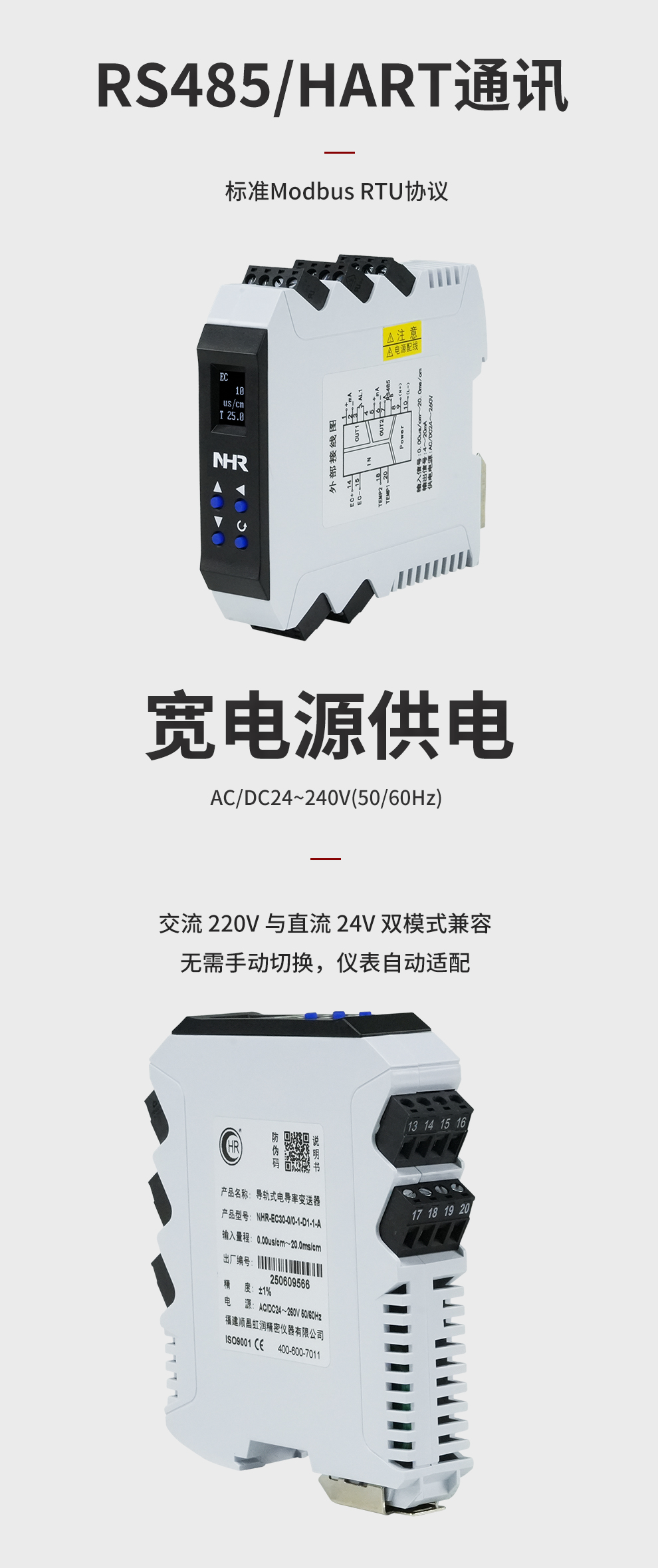 虹潤公司是專業(yè)生產(chǎn)水質(zhì)分析儀的國家專精特新“小巨人”企業(yè)。生產(chǎn)的導(dǎo)軌式電導(dǎo)率變送器,具有測量穩(wěn)定不跳字,液晶顯示按鍵操控,變送輸出精準(zhǔn),寬范圍電源供電,RS485或HART通訊等特點。產(chǎn)品獲得一種信號發(fā)生裝置、智能化控制器等2項國家發(fā)明專利;主持起草現(xiàn)場設(shè)備集成等5項智能制造國家標(biāo)準(zhǔn),以及現(xiàn)場設(shè)備工具(FDT)接口規(guī)范、工業(yè)過程控制系統(tǒng)用模擬輸入兩位或多位輸出儀表、過程分析技術(shù)系統(tǒng)等3項國家標(biāo)準(zhǔn);參與國際5G標(biāo)準(zhǔn)制定,取得導(dǎo)軌電導(dǎo)率變送器等3項相關(guān)軟件著作權(quán)。產(chǎn)品廣泛應(yīng)用于實驗室、水處理、環(huán)境監(jiān)測、制藥、食品、農(nóng)業(yè)、工業(yè)流程控制等諸多領(lǐng)域。