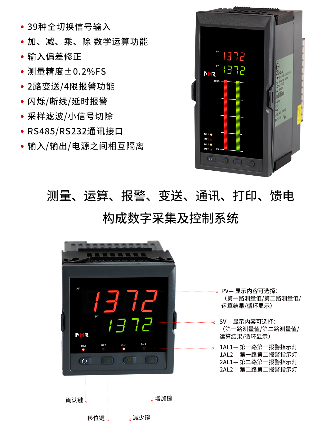 虹潤(rùn)公司是專業(yè)生產(chǎn)數(shù)顯表的國家專精特新“小巨人”企業(yè),生產(chǎn)的智能雙路數(shù)顯儀表,具有全切換信號(hào)輸入,加減乘除數(shù)學(xué)運(yùn)算,高抗干擾,過壓過流保護(hù),RS485/RS232通訊等特點(diǎn)。產(chǎn)品獲得巡回檢測(cè)顯示方法及裝置、儀表殼體等2項(xiàng)國家發(fā)明專利,主持起草工業(yè)過程控制系統(tǒng)用模擬輸入兩位或多位輸出儀表、物聯(lián)網(wǎng)智能溫度儀表通用技術(shù)條件等2項(xiàng)國家標(biāo)準(zhǔn),,以及通信系統(tǒng)多通道數(shù)據(jù)采集控制終端規(guī)范軍用標(biāo)準(zhǔn),參與國際5G標(biāo)準(zhǔn)制定,取得雙回路數(shù)字顯示控制儀表等3項(xiàng)相關(guān)軟件著作權(quán)。產(chǎn)品廣泛應(yīng)用于電力、石化、冶金、化工、造紙、食品、輕工、制藥、熱處理、水處理、機(jī)械配套等各種工業(yè)現(xiàn)場(chǎng)。