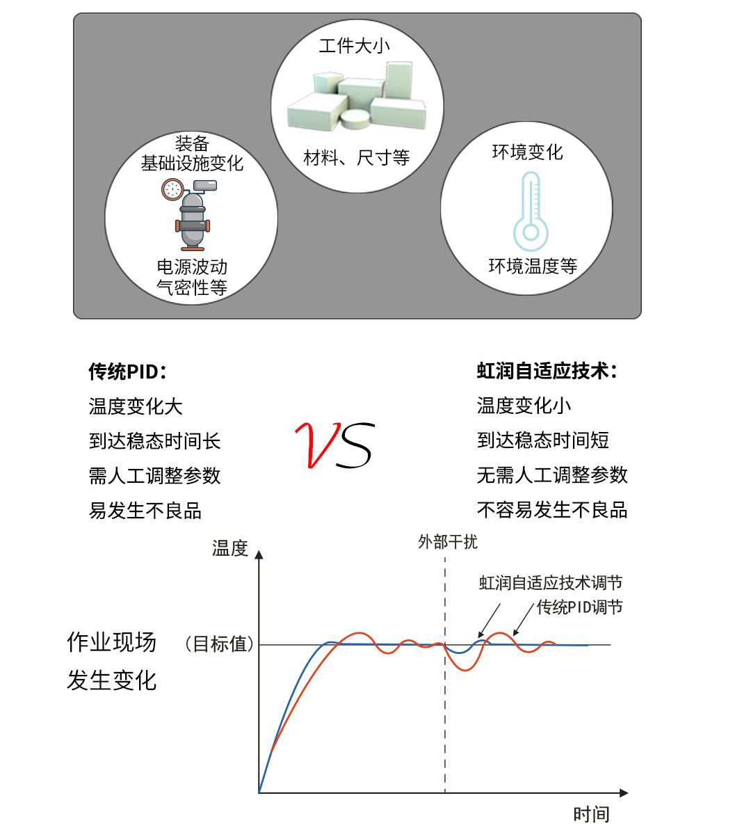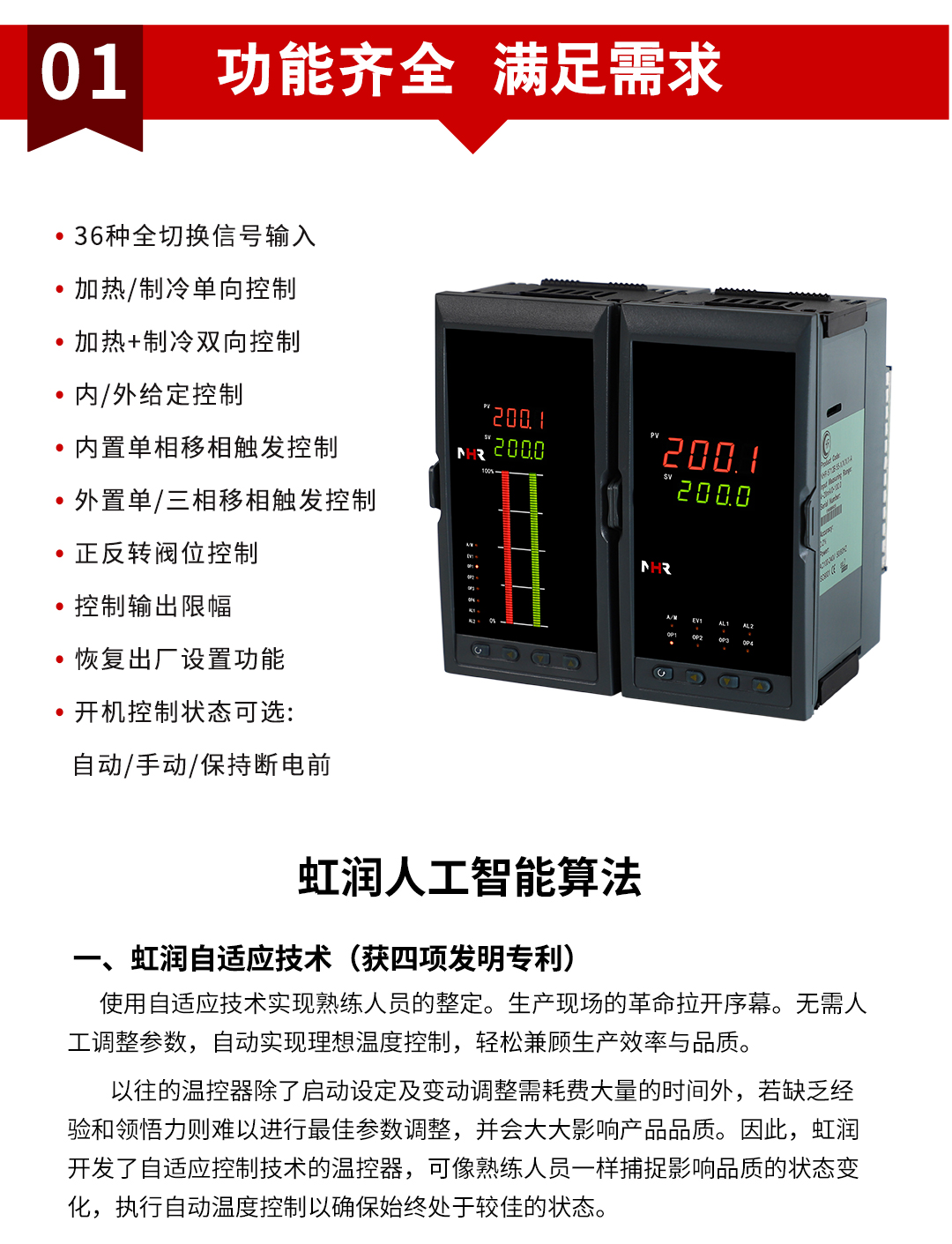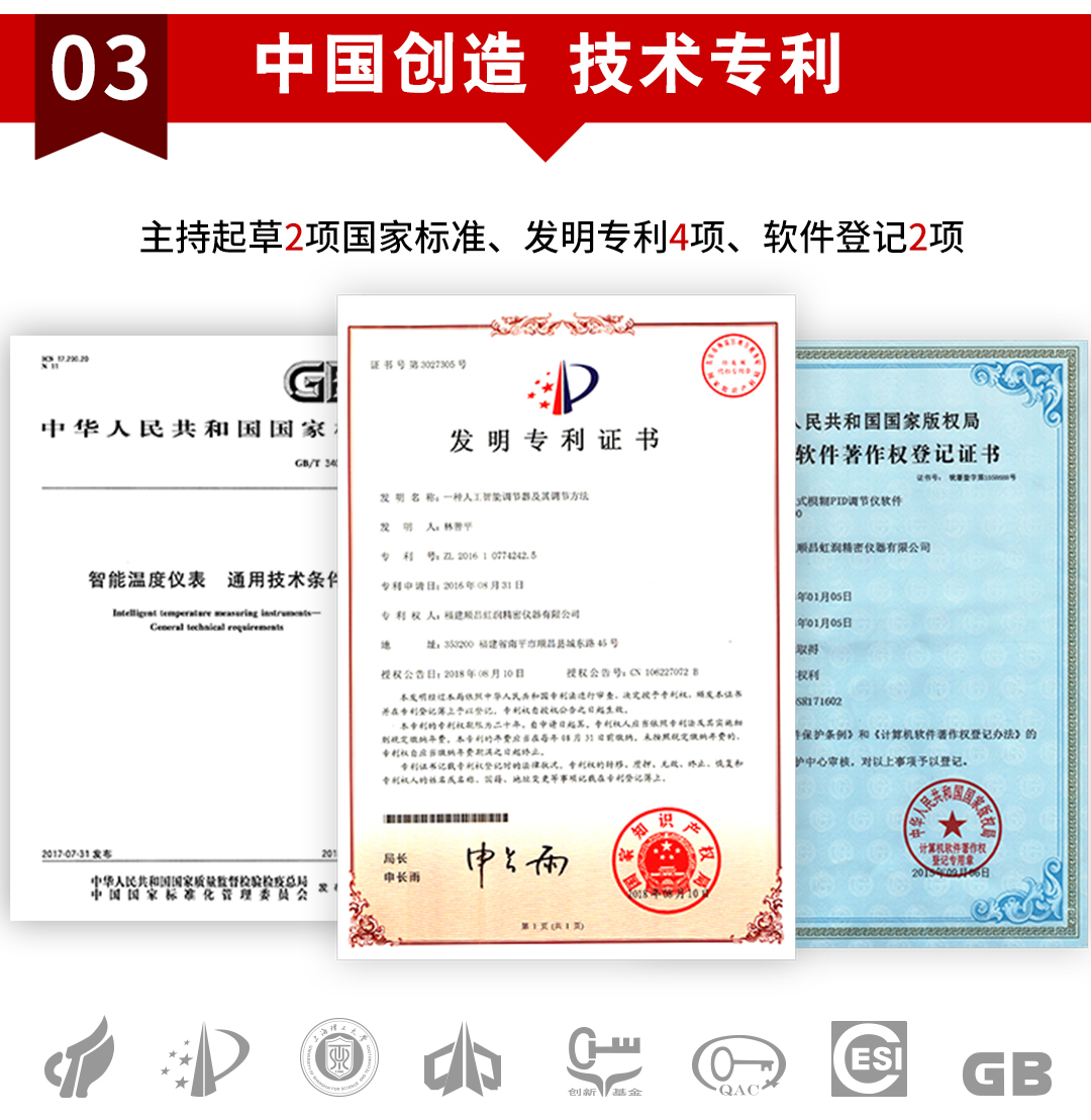 虹潤公司是專業(yè)生產(chǎn)溫控器的國家專精特新“小巨人”企業(yè)。生產(chǎn)的人工智能溫控器,具有真正人工智能算式,無需人工整定參數(shù),控制精度可達(dá)±0.1°C,多種輸出類型,高抗干擾等特點。產(chǎn)品獲得模糊PID控制儀及控制方法、人工智能調(diào)節(jié)器、智能化控制器、移相觸發(fā)控制器、閥門自動手動無擾動操作控制方法及裝置等5項國家發(fā)明專利,主持起草工業(yè)過程控制系統(tǒng)用模擬輸入兩位或多位輸出儀表、物聯(lián)網(wǎng)智能溫度儀表通用技術(shù)條件、工業(yè)過程測量和控制系統(tǒng)用智能調(diào)節(jié)器等3項國家標(biāo)準(zhǔn),以及通信系統(tǒng)多通道數(shù)據(jù)采集控制終端規(guī)范軍用標(biāo)準(zhǔn),參與國際5G標(biāo)準(zhǔn)制定,取得模糊PID溫控儀等3項相關(guān)軟件著作權(quán)。產(chǎn)品廣泛應(yīng)用于電力、石化,冶金、制藥、食品等幾乎所有工業(yè)現(xiàn)場,實現(xiàn)精準(zhǔn)控溫,保障生產(chǎn)安全與質(zhì)量。